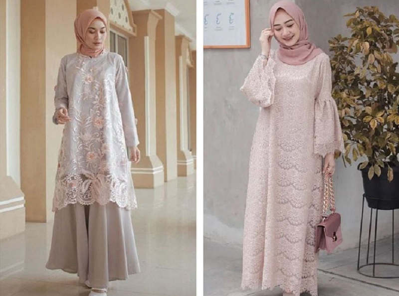 Penggunaan aksen brokat pada bagian dada atau lengan berpadu dengan bawahan polos memberikan tekstur yang kaya tanpa terlihat berlebihan. Model ini sangat pas bagi yang ingin tampil lebih menonjol namun tetap menjaga sisi kesantunan. Detail brokat halus menambah nilai estetika tinggi pada tampilan Lebaran yang spesial.