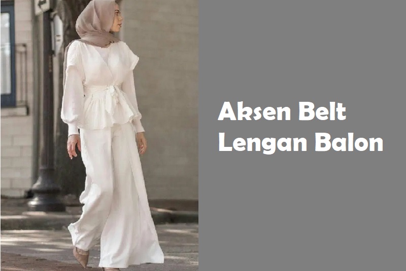 Atasan putih model crossover menyerupai kimono dengan detail v-neck dan lengan balon, dilengkapi belt di pinggang. Celana kulot melebar ke bawah membuat tampilan terkesan chic, cocok dipadukan hijab dan stiletto warna netral.