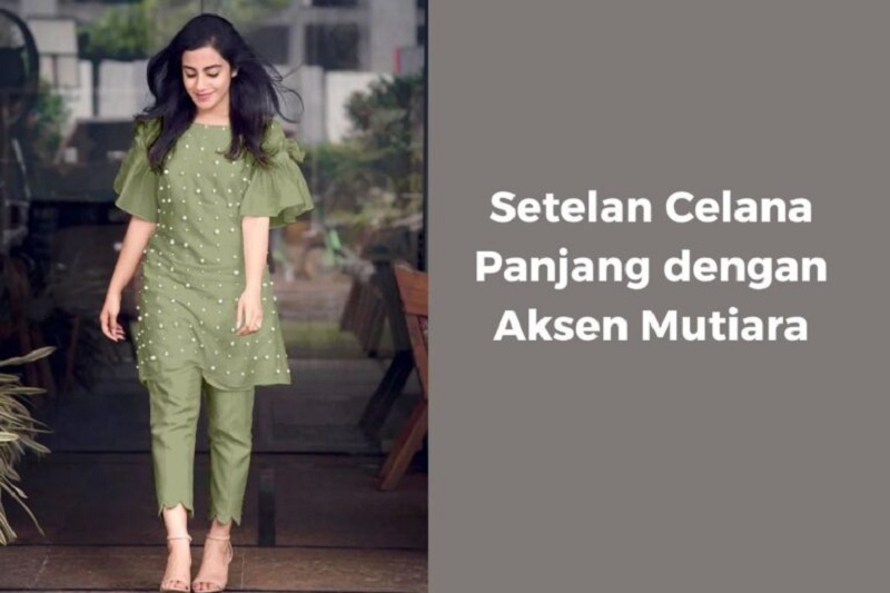 Model baju pesta setelan celana panjang ini menonjolkan detail mutiara yang tersebar di bagian atasan panjang hingga lutut dan celana yang fit di kaki. Warna hijau segar dan aksen ruffle pada lengan menambah kesan dinamis.
