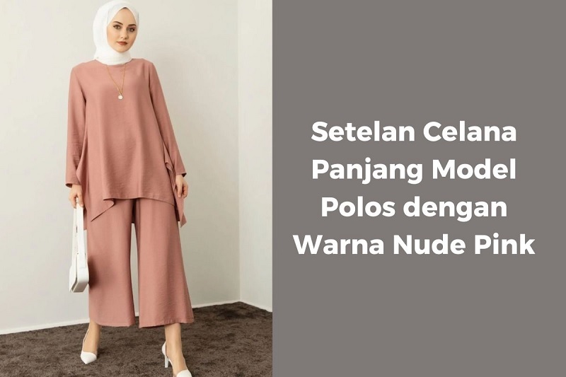 Warna nude pink yang lembut memberi kesan anggun dan simpel. Atasannya dibuat memanjang di sisi samping dipadukan dengan celana kulot. Tampilan semakin manis dengan hijab pashmina senada, handbag, dan kitten heels warna putih.