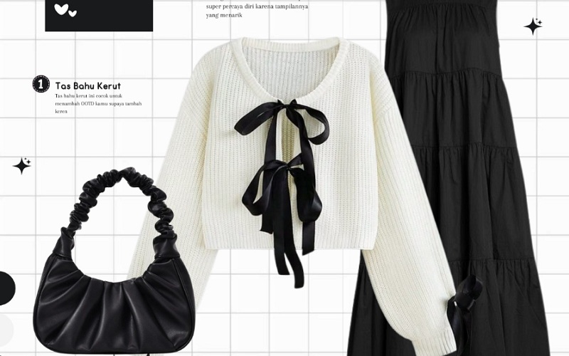 Inspirasi setelan Korea juga terungkap di akun TikTok @bajumurah.id. Adapun inspirasinya yaitu oneset coquette. Biasanya bahan yang digunakan untuk memberikan kesan soft atau dreamy. Item fashion ini berupa busana berwarna hitam lengkap dengan motif pita. Lalu ada pula tambahan renda berwarna putih. Saat menggunakan setelan wanita tersebut, penampilan terlihat berbeda dari sebelumnya. Kesan ala Korea juga terpancar dengan jelas.